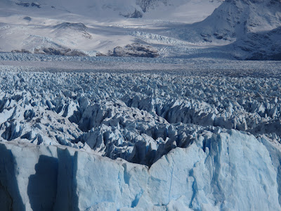 It isn't the largest glacier in the park though. Viedma and Upsala are over three times its size. It is the main tourist attraction partly for historical reasons (see Francisco Moreno on wikipedia or google) but also because it happens to be easily accessible. The glacier is also special because it is still advancing, with a speed of about 1.5m/day. It doesn't really seem to more forward though because bits and pieces are continually falling off and crashing into the water making quite spectacular splashes.